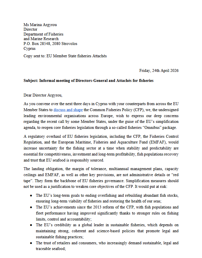 This open letter was signed by Seas At Risk, the Environmental Justice Foundation, Coalition Clean Baltic, ClientEarth, Oceana, and WWF EU. It urges Mrs Marina Argyrou, Director of the Department of Fisheries and Marine Research of Cyprus and presiding over the informal meeting of EU Fisheries Directors General and Attachés (26-28 April 2026), to resist growing pressure from some Member States to reopen core fisheries legislation under a so-called “simplification package”, and to prioritise the full and timely implementation of existing Common Fisheries Policy (CFP) provisions as a prerequisite to achieving sustainable EU fisheries.